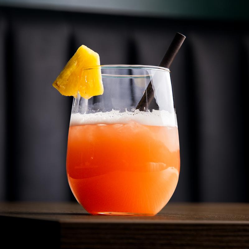 Gin, Triple Sec, pineapple juice, mango juice, lime juice, maple syrup, plum balsamic