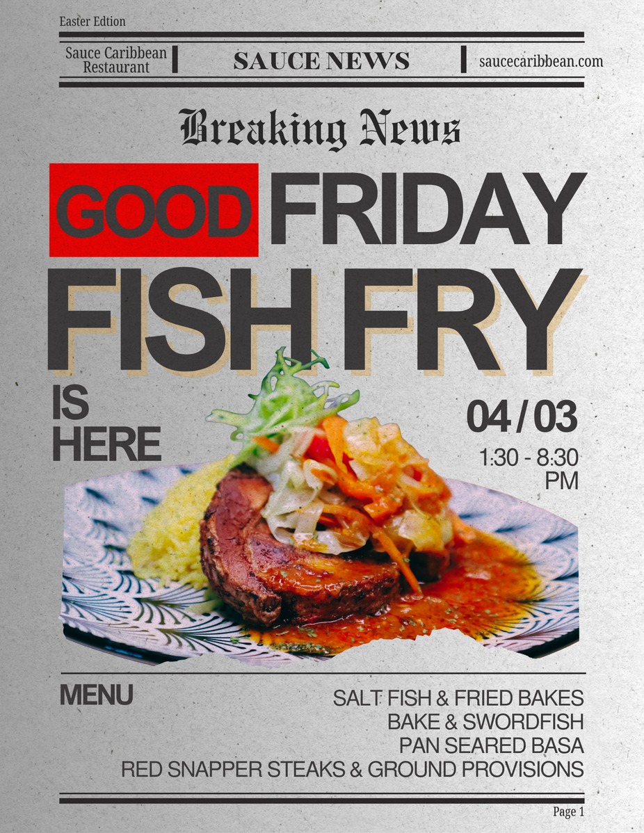 The Good Friday Fish Fry is making headlines at Sauce. Fresh seafood, Caribbean flavours, and a lineup worthy of the front page: Salt Fish & Fried Bakes • Bake & Swordfish • Pan Seared Basa • Red Snapper & Ground Provisions.